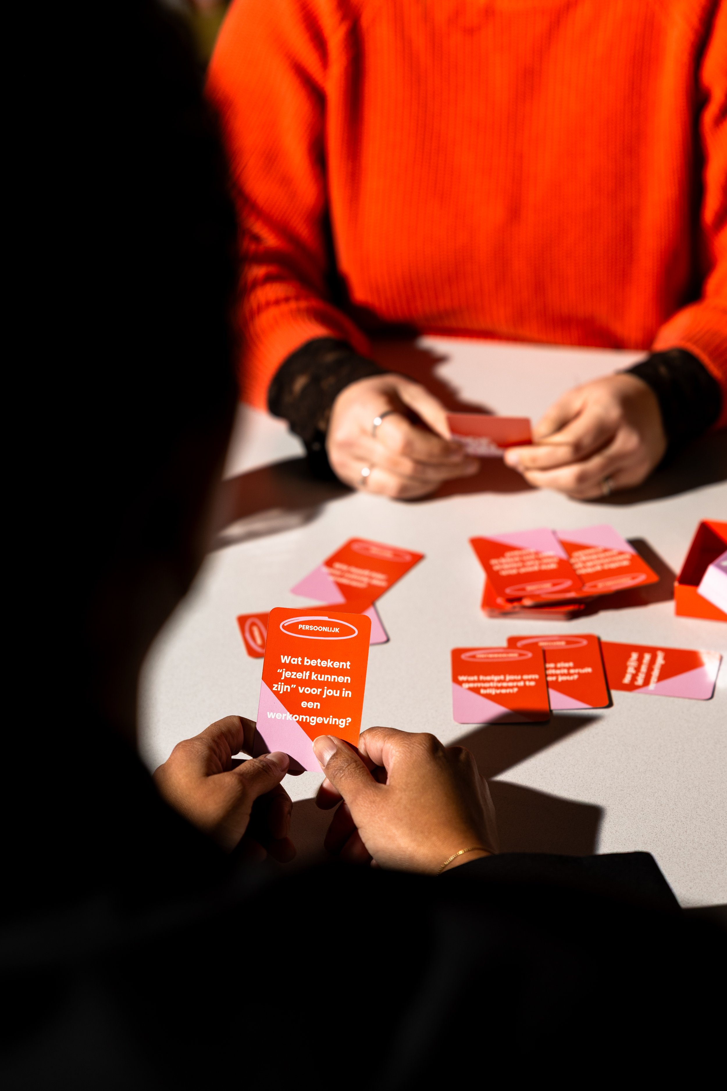 Laat de medewerker zelf een kaart kiezen en vertel waarom die vraag raakt.Workshop of teamsessie